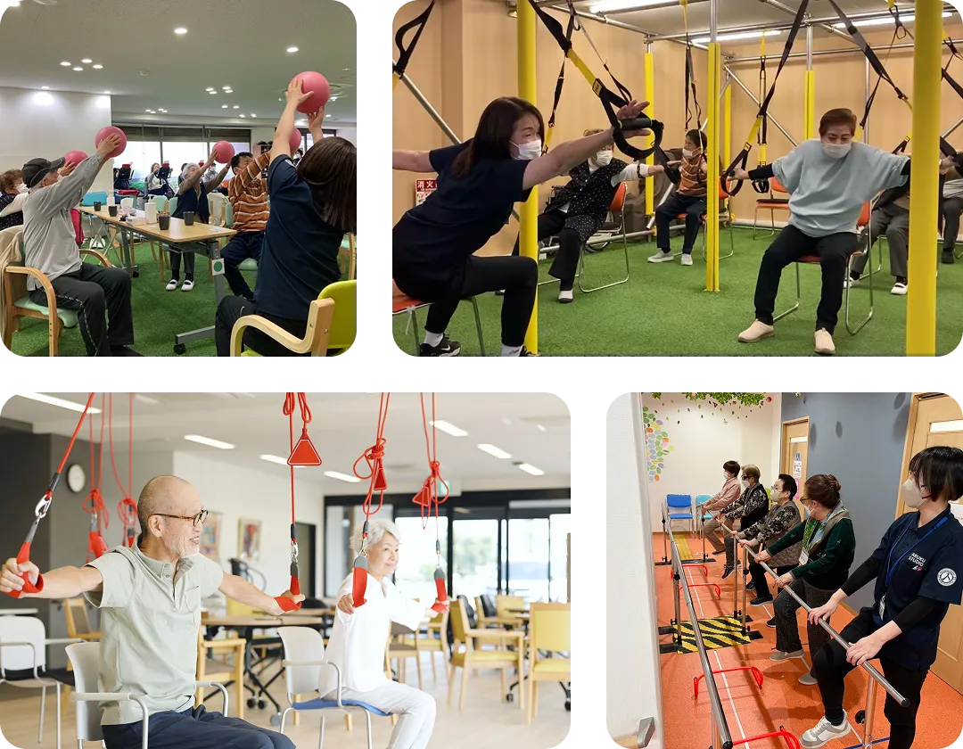 - 個別リハビリ中心:ご利用者様それぞれに合ったプログラムを作成しています。
